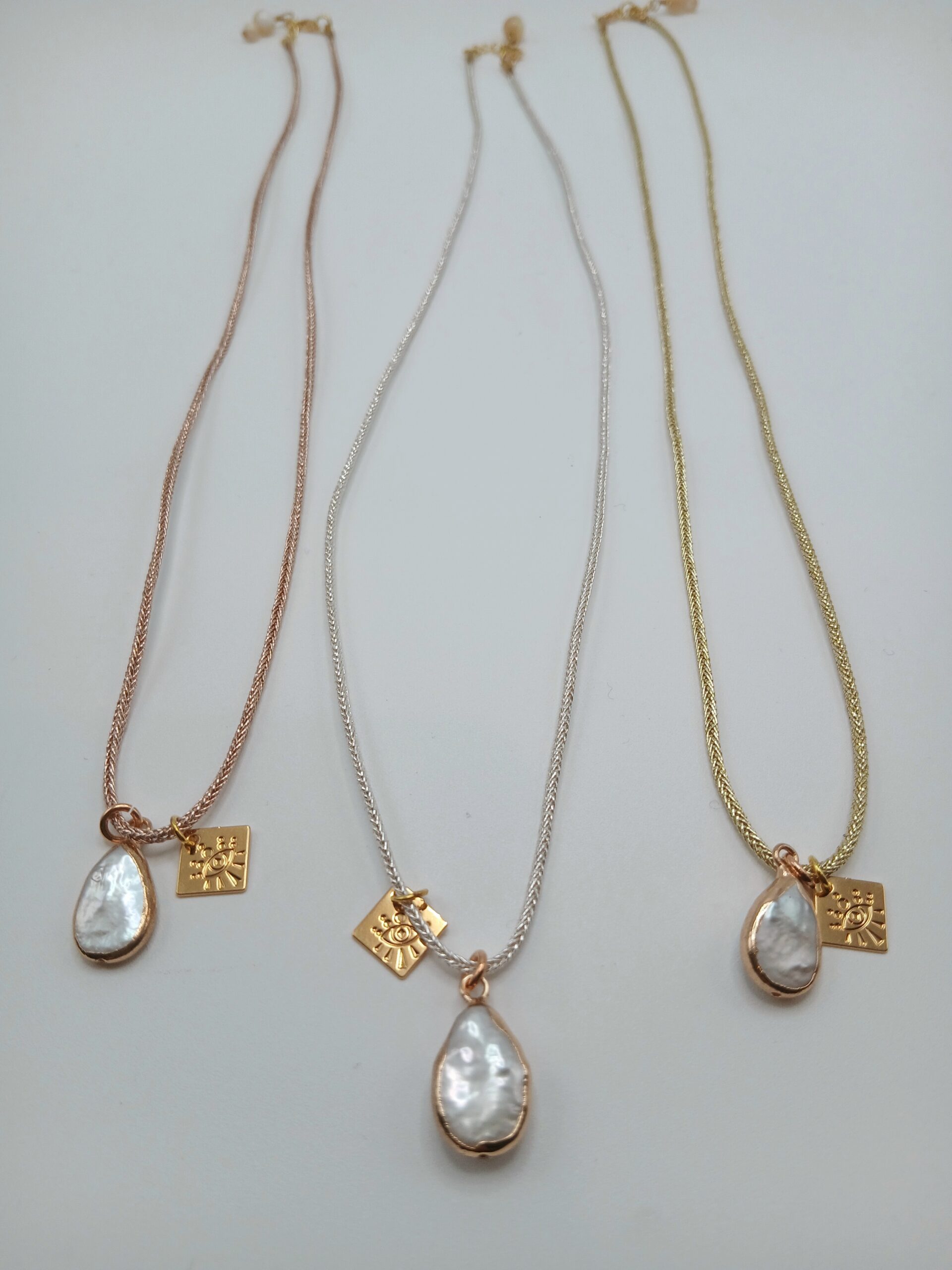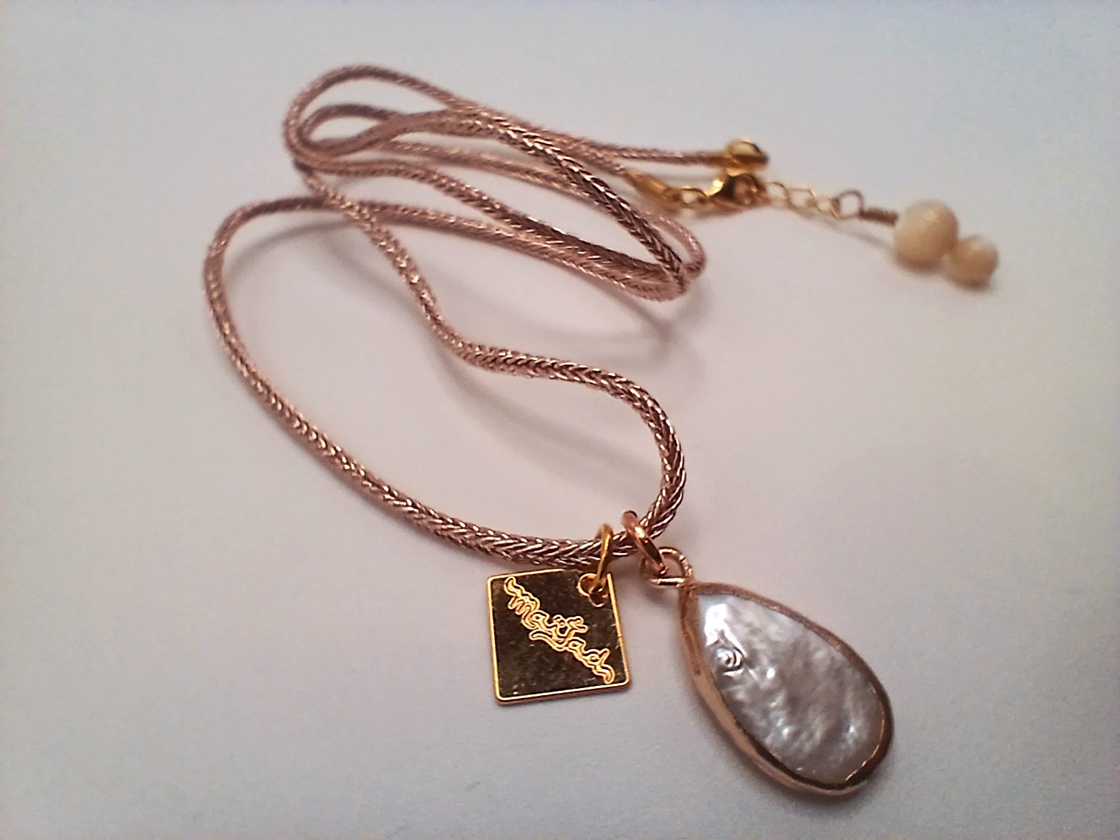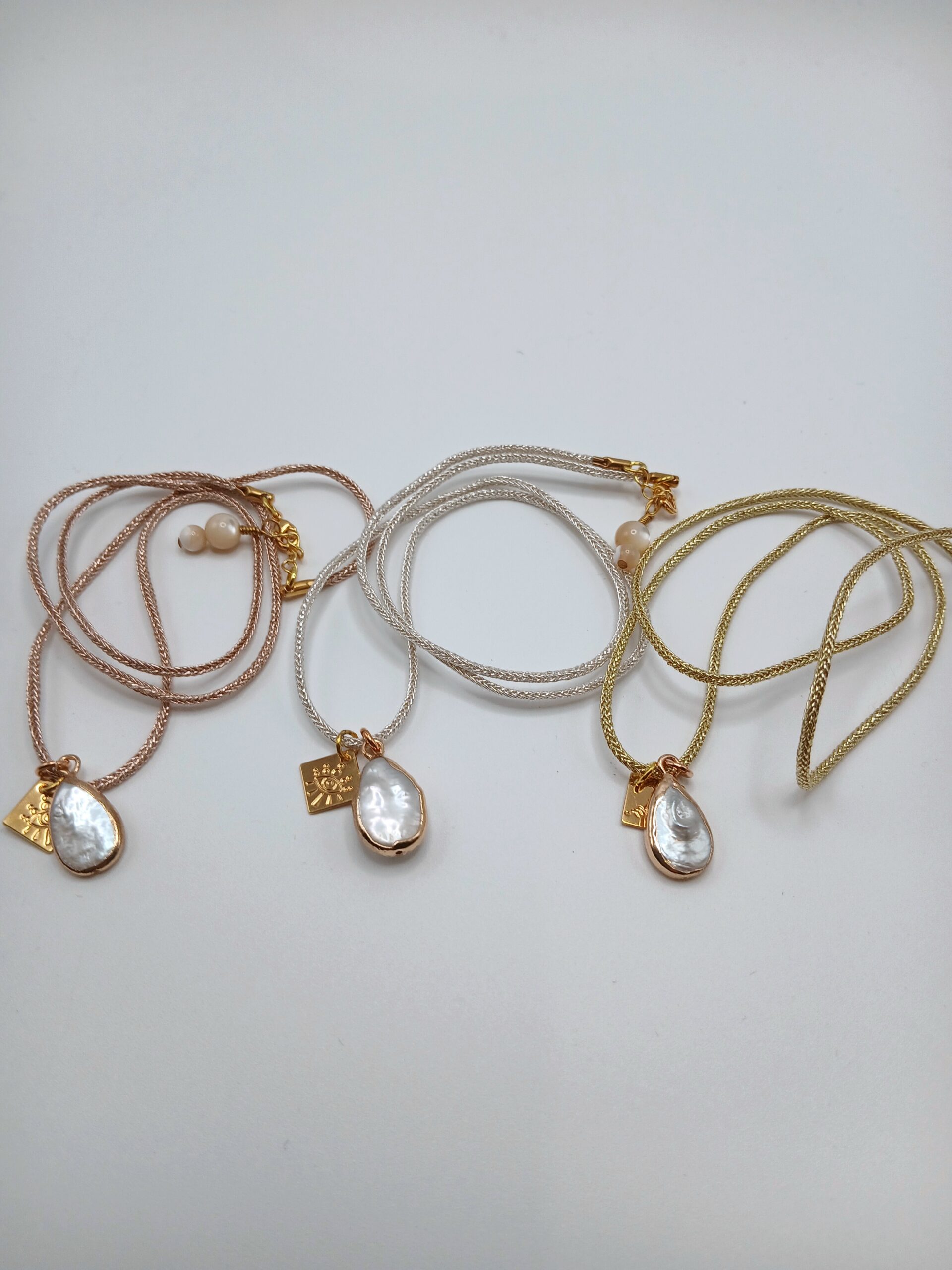 Collier monté sur cordon « Keitane » or rose, orné d’une perle d’eau et de perles en pierres naturelles (nacre).