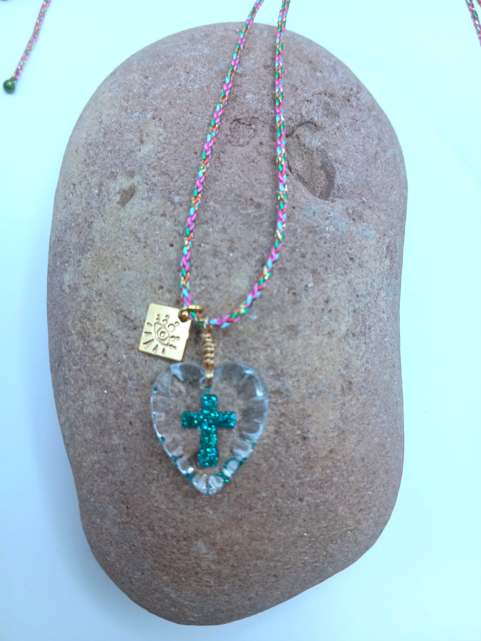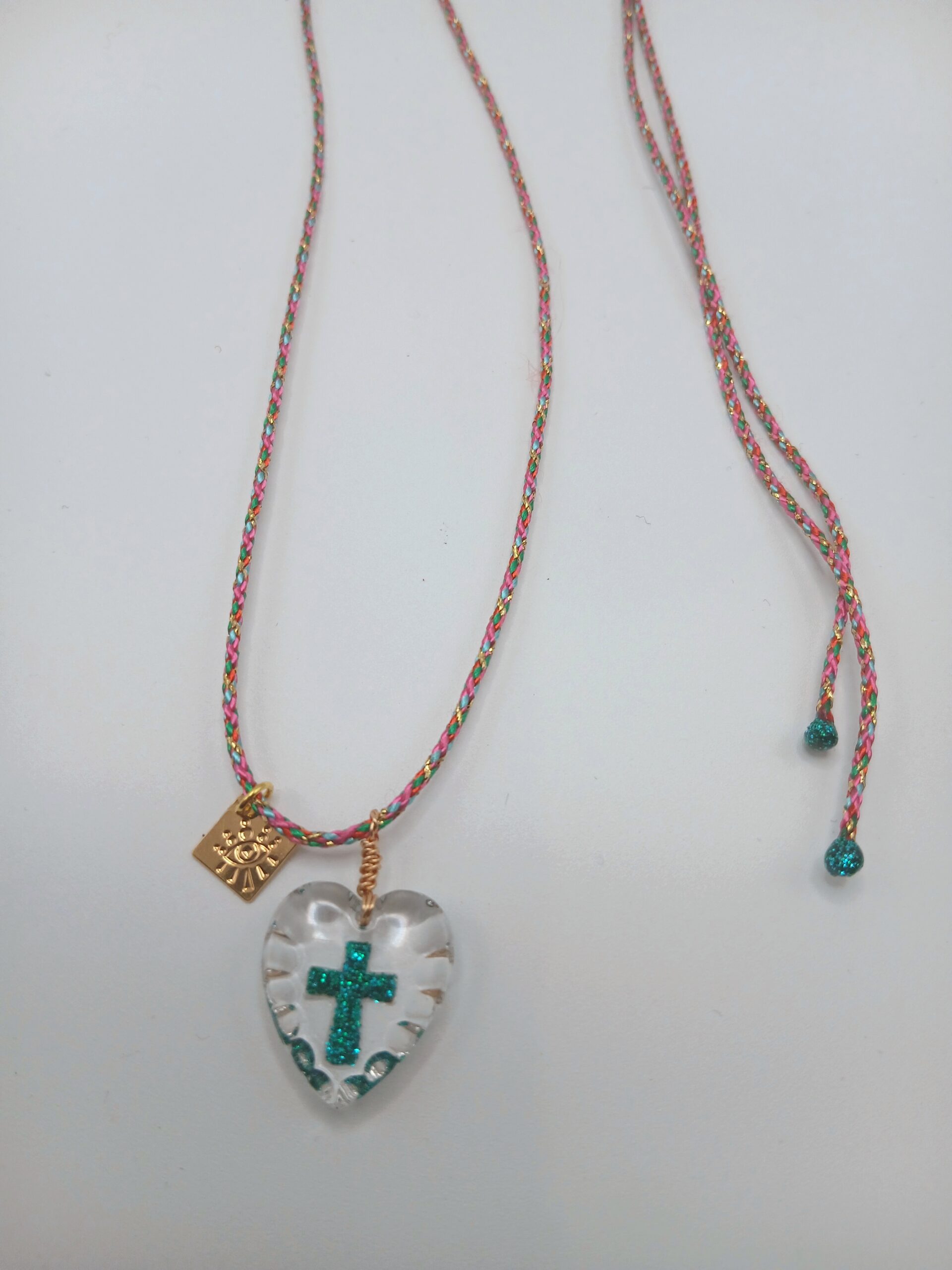 Collier cordon en soie rose, orné d’un cœur en verre avec une petite croix pailletée bleu turquoise. À porter en ras-de-cou ou en collier long, réglable facilement grâce à la fermeture coulissante. Série limitée