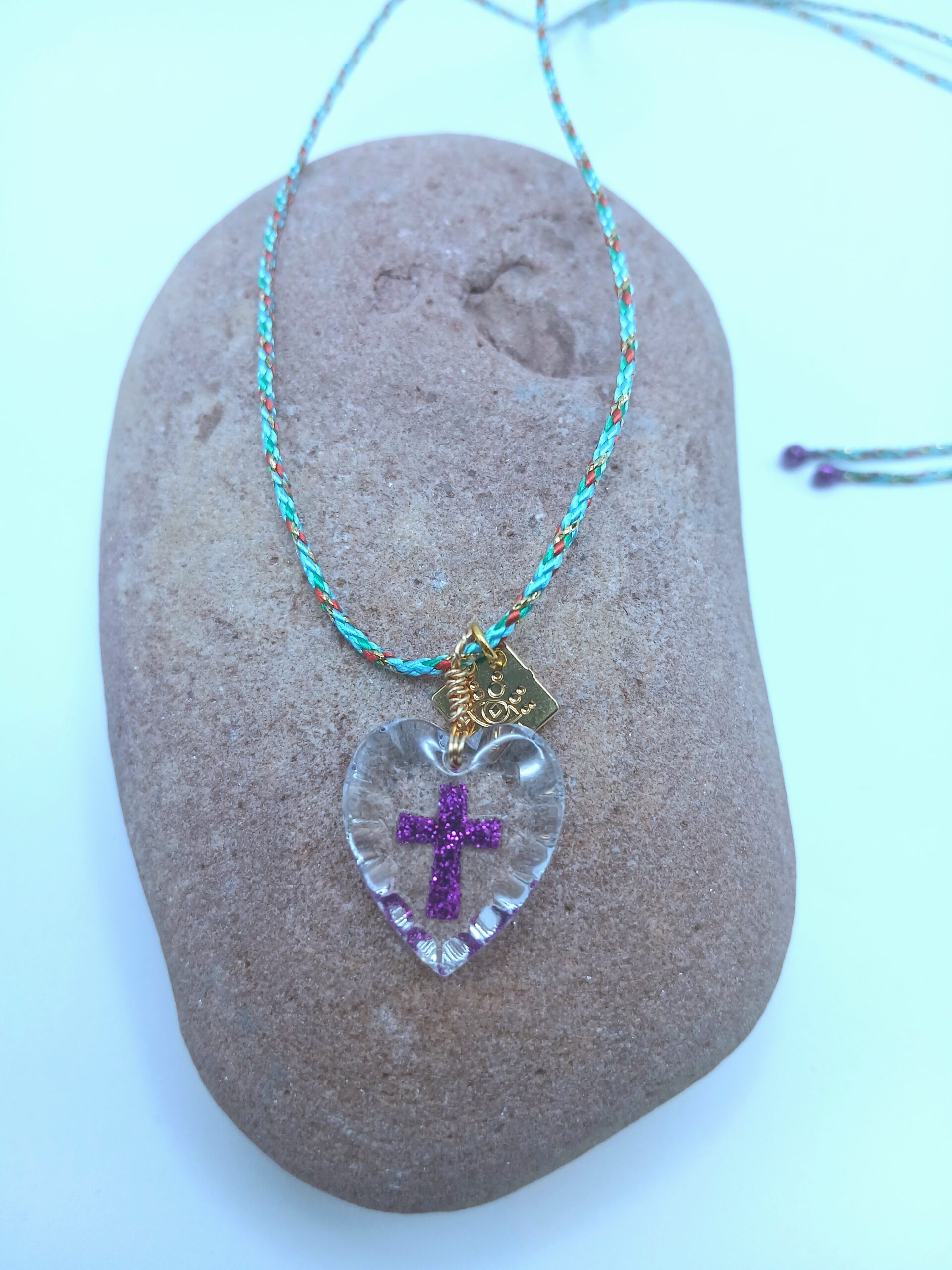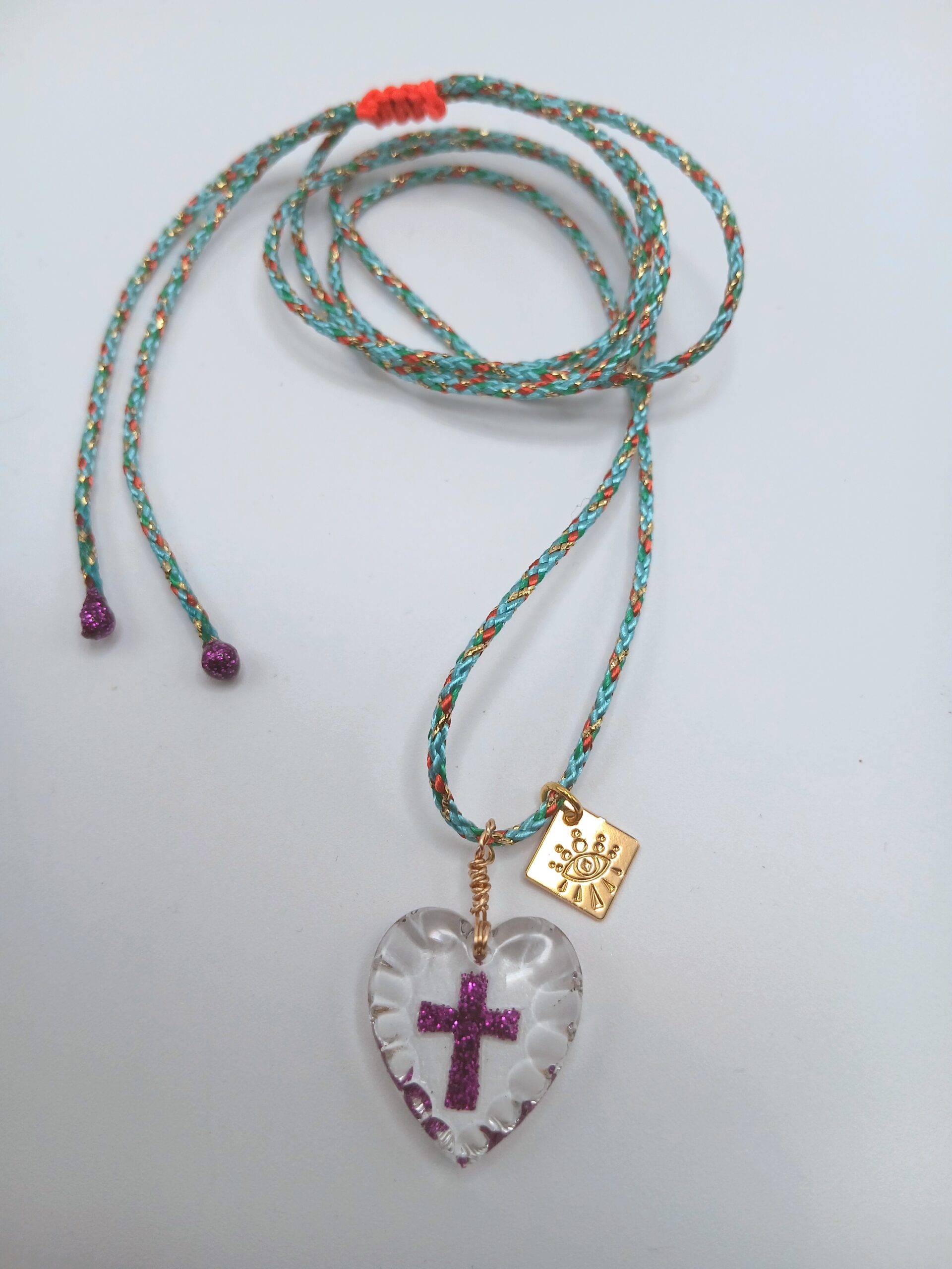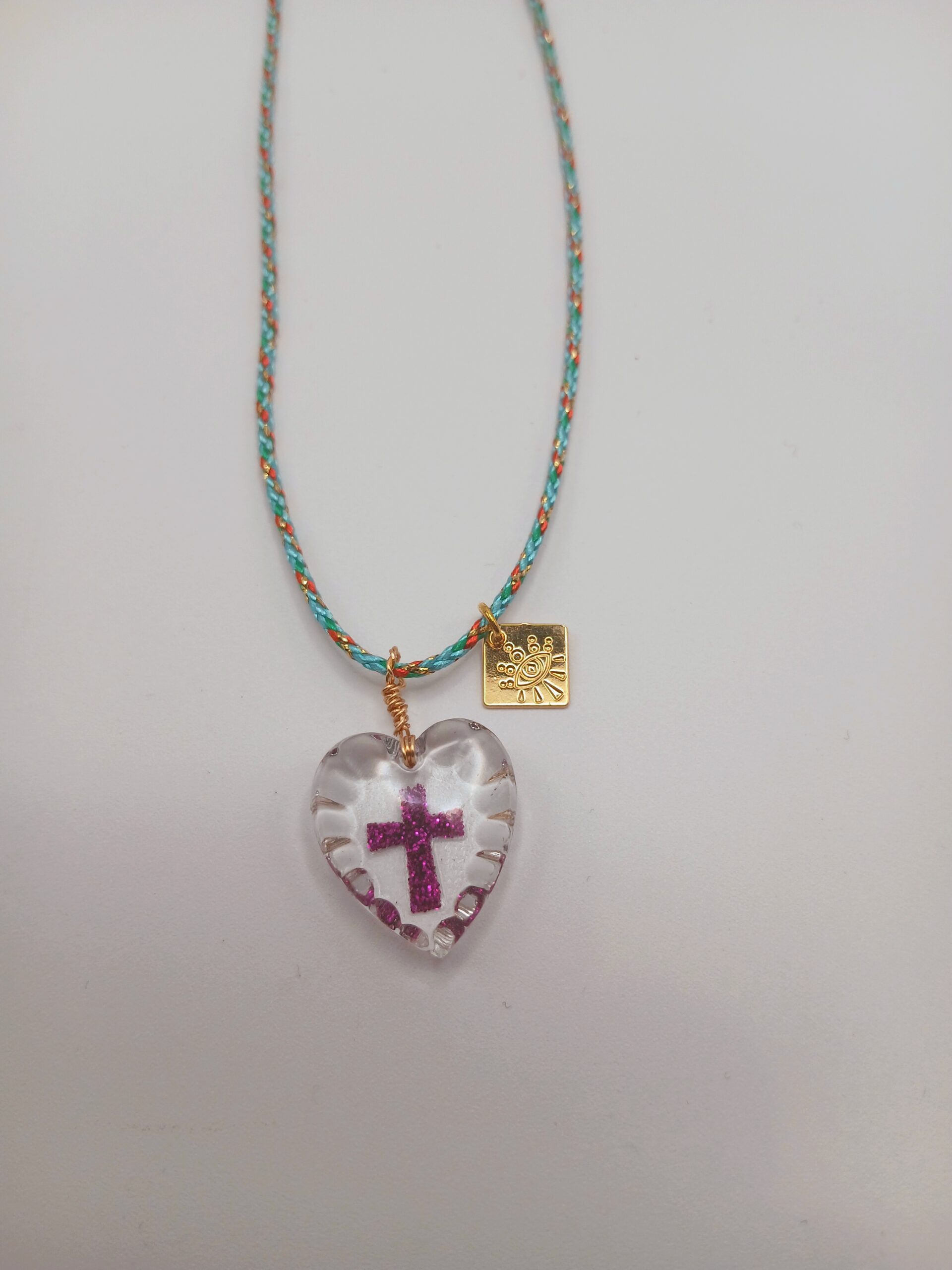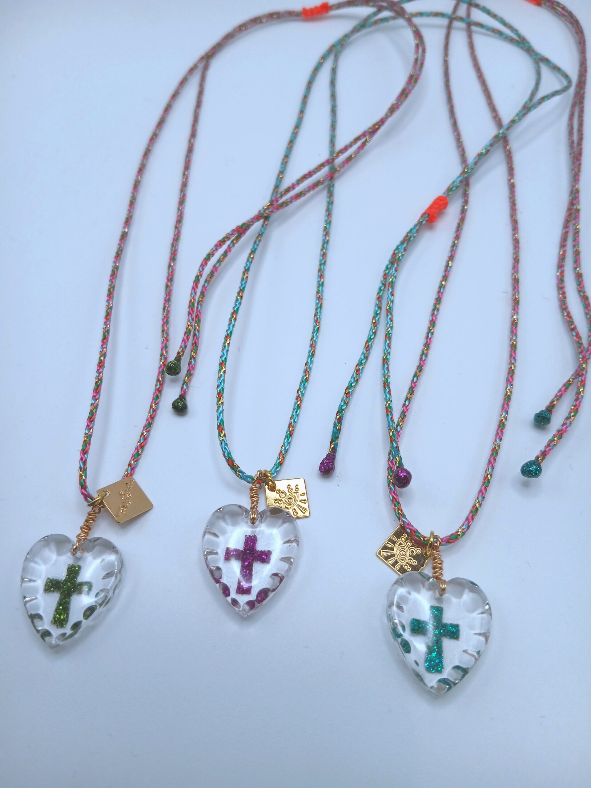 Collier cordon en soie bleu, orné d’un cœur en verre avec une petite croix pailletée violet. À porter en ras-de-cou ou en collier long, réglable facilement grâce à la fermeture coulissante. Série limitée